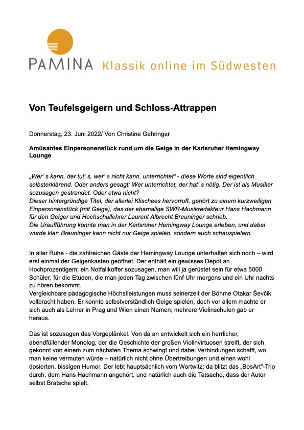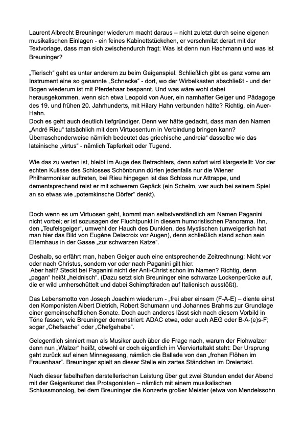 fast alles, was Sie schon immer über Geigen und Geiger wissen wollten – Szene für einen Schauspieler, der Violine spielen kann bzw. einen Geiger, der schauspielen kann - von Hans Hachmann, angeregt durch Laurent Albrecht Breuninger.